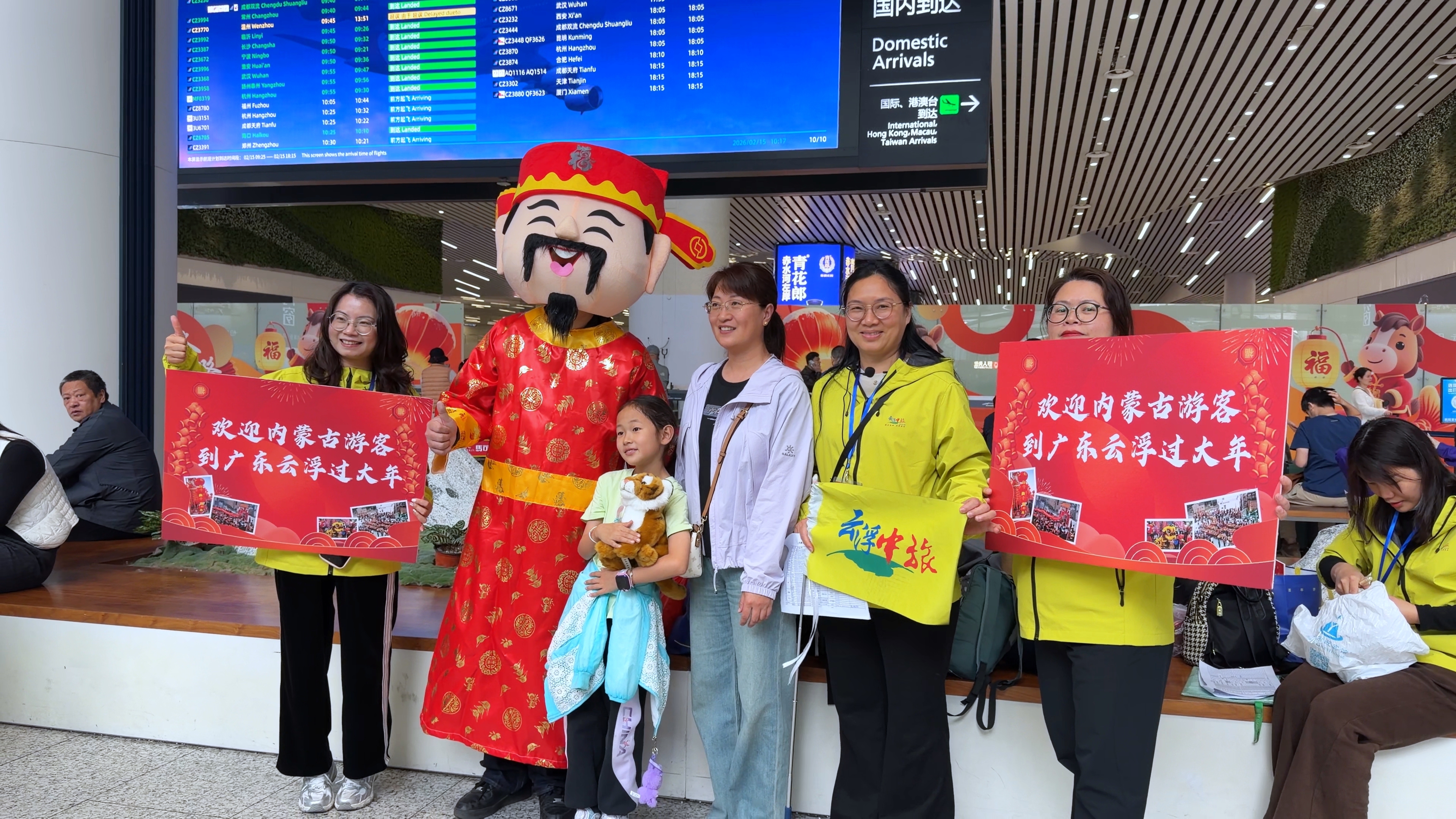 上午10时,广州白云机场出站口,“欢迎到云浮过年”的醒目招牌,喜庆味、年味十足的财神迎宾,热情的工作人员,尽职的新闻记者,让客人们第一时间感受到了云浮的热情。“下飞机的欢迎仪式,让我的心特别暖,内蒙、广东两地相隔遥远,这次是我第一次感受云浮年俗,感受到云浮人的热情。我们对这个异地春节充满期待。”内蒙古游客、自媒体博主杨火火说。
