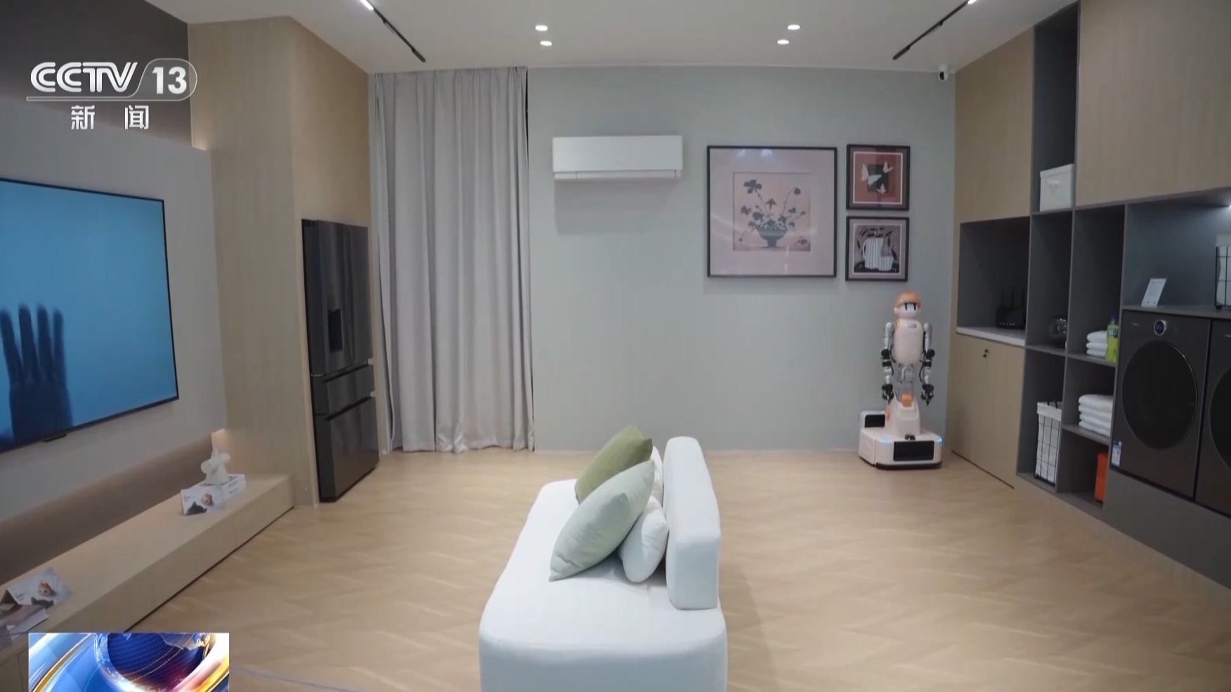 总台记者 陈阳:我们现在来到了无家务之家,什么是无家务之家?可以看到沙发上有一个围巾,机器人能不能把围巾放到洗衣机里清洗?
